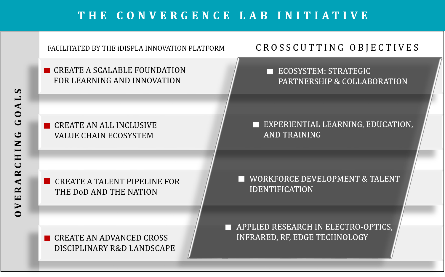 A primary objective of the Convergence Lab Initiative is to enable and endure scientific and technical base, and guide research and investments over the next decade towards delivering a strong foundation for EO/IR, RF and AI/Edge/security science and technologies. In addition, provide experiential learning, education and workforce development. From a research and development perspective, the objectives are to stand up the five primary pillars and embed these emerging sciences in the derivative areas of research to drive new discoveries, enhancements, and prototypes in the applied areas of EO/IR, RF and AI/Edge/Cyber technologies. Activities performed within and across these pillars will drive innovation, new capabilities, and potential future products at the intersection of Defense and commercial applications. The convergence of these pillars will be embedded research within the CLI derivative areas and is expected to yield decision support tools with application to intelligent sensing, imaging, security, computing and communication capabilities among others.